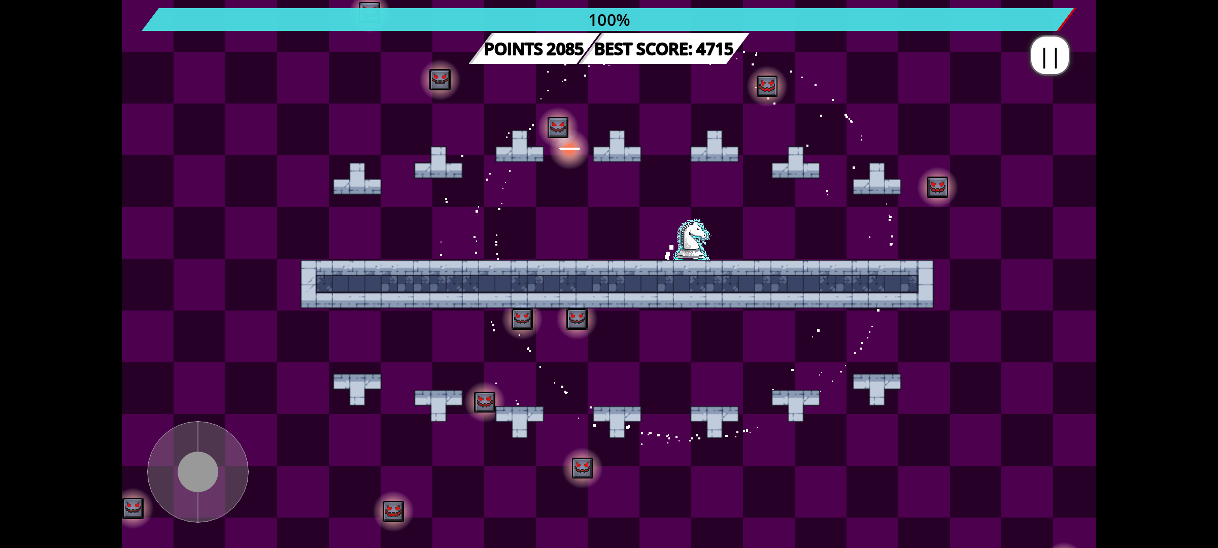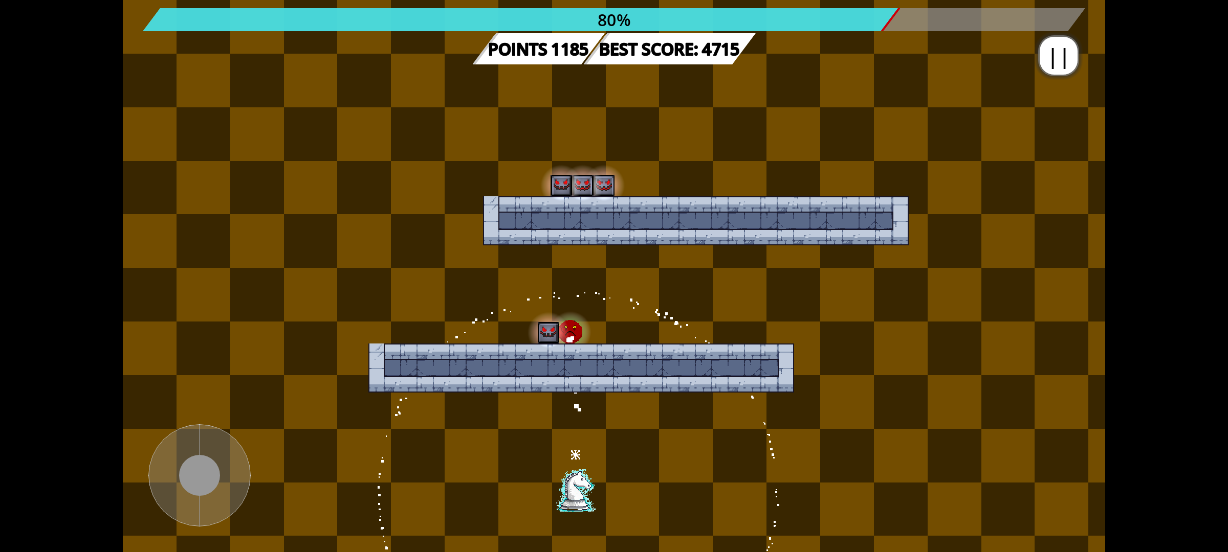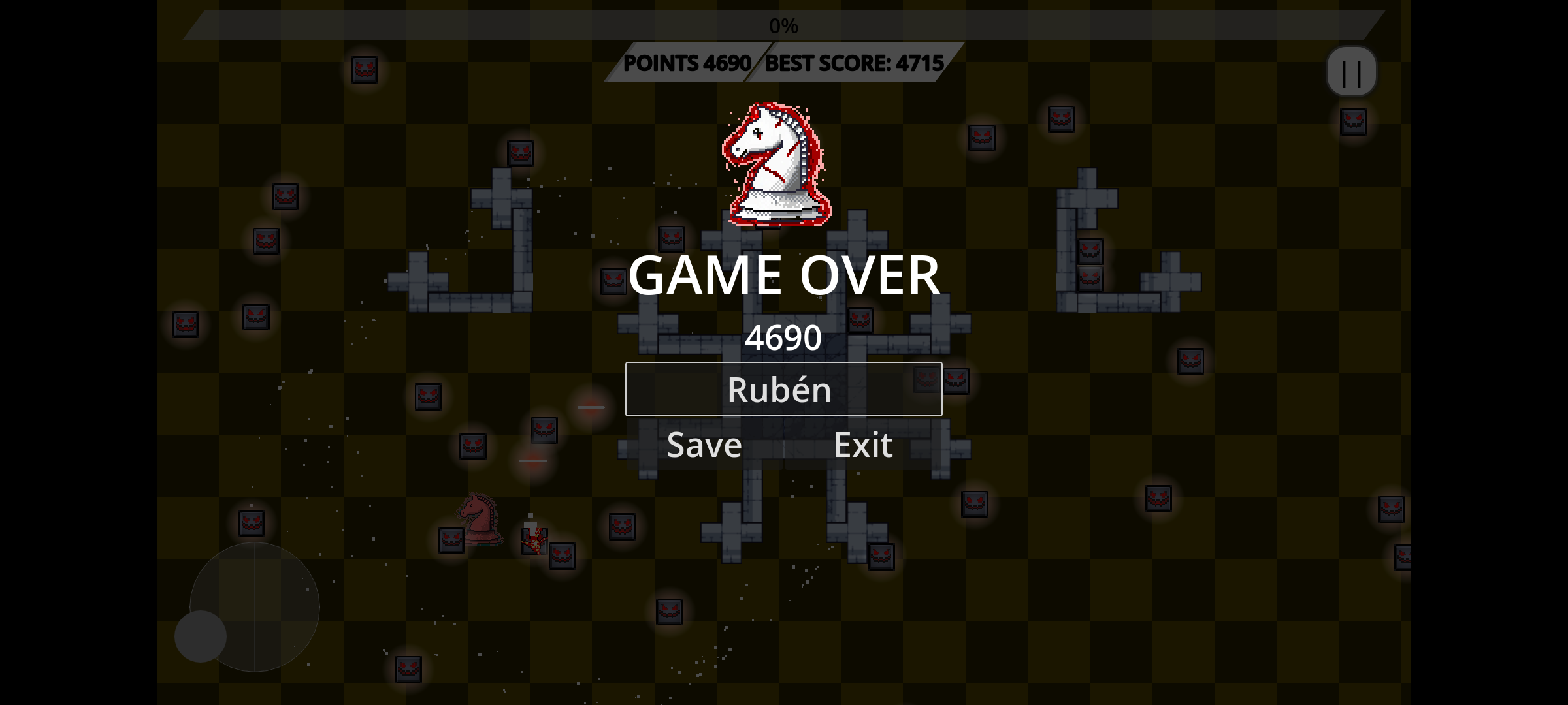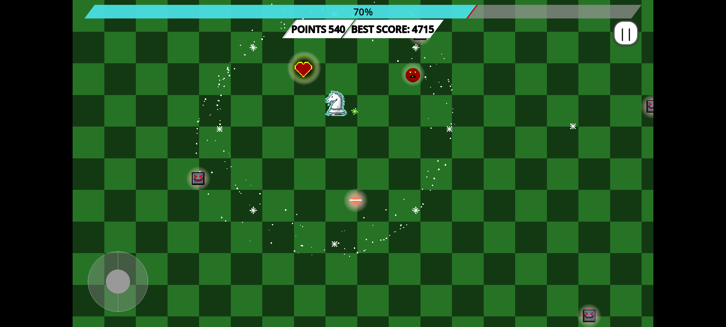 El Ajedrez se encuentra en caos. Controlas un caballero blanco en un mundo pixel art hostil, donde debes moverte rápidamente y sobrevivir. Utiliza los obstáculos para conseguir tiempo, tu instinto de supervivencia te ayudará.