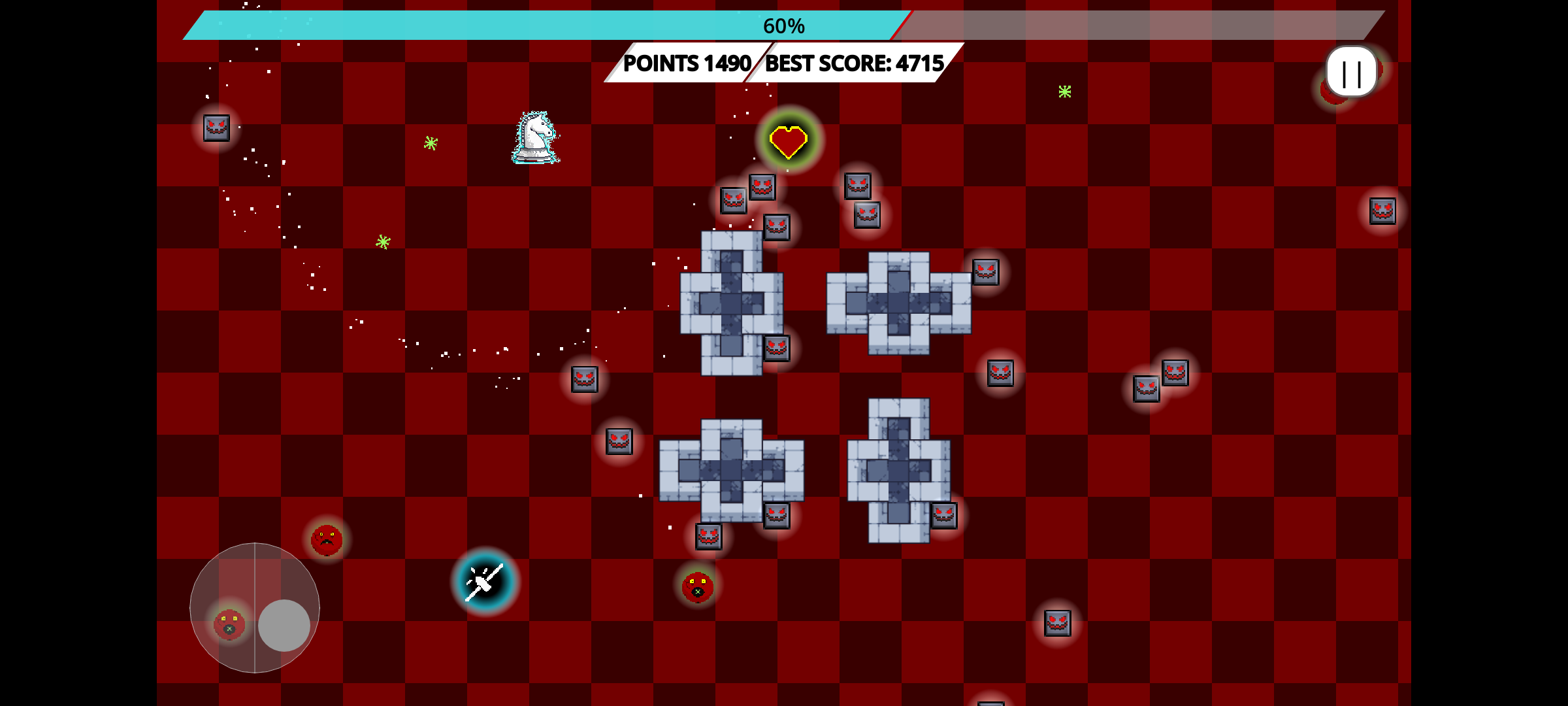 Tu caballero dispara automáticamente a los enemigos que se encuentran en su radio de acción. Cada nivel es un diseño diferente, con obstáculos que transforman el tablero en un laberinto. A medida que avanzas, aumenta el número de enemigos y la velocidad de spawn, llevándote al límite en el nivel 10.
